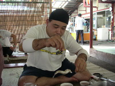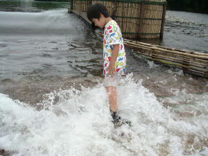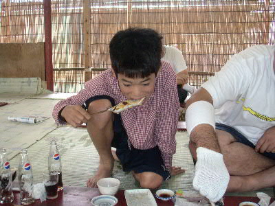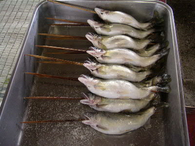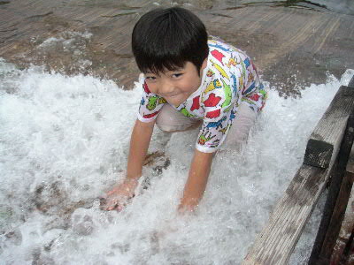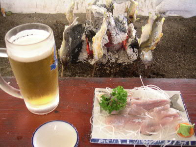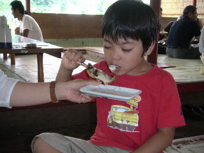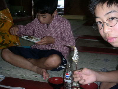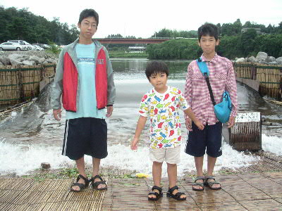 | 8月28日(日) ハ〜イ♪ 今年も行ってきましたよ〜 やな いつもお世話になっている爆釣速報のやな情報をクリック♪ 今回はどうしてもしたい事が・・・ 調べた結果、目的地は栃木県の「黒羽観光やな」に決定! 予約も済ませてやなにGO! 親戚の幾太郎君&由紀夫君も拉致しました^^ 10時頃、三郷を出発! オイ!少しは静かにしろ! 11時には上河内パーキングで休憩♪ 三郷から1時間は近いっすね^^ 矢板インターをおりて12時頃目的地に到着。 ↑黒羽観光やなに到着 鮎注文&場所確保 カミさんを残し、鮎が来るまで「やな」で遊ぶ事に。 走らないでユックリ渡りなさい!とダイキに言うと、 うん!わかった!!と言ってダッシュしやがった(怒) ↑ハイチーズ^^ 左 幾太郎君 ・ 右 由紀夫君 ん〜 気持ちい〜い やな最高っす! ん??何かピョンピョンしてる・・・ん?・・・お〜鮎発見! 鮎をゲットしまくる! 注意 捕まえた鮎は箱の中へ! 持ち帰ることは出来ません!! 夢中で鮎を探していたら、周りから笑え声が! ん??貸切状態だったのがいつの間にやなは観光客でいっぱい・・・ で観光客の目線を追うと・・・ギェ―――――!! これから先は、良い子は絶対にまねしないでね♪ ん? おい! そこで泳ぐなー!(爆) マジ大爆笑 ビチョビチョのダイキをカミさんの所に連れて行くと・・・カミさんの顔が・・・怖い ダイキの着替えを済ませ待ってました鮎♪ 今回はどうしてもしたい事とは、炉端で鮎を自分で焼くことだ! ムフフ♪うまそう〜 塩も自分でね☆ ん〜これこれ!Novさんの写真はこれか!初体験 焼けるのを待つ間はヤッパリ、ビールでしょ! く〜うまい!もうイッパイ^^ 鮎が焼けたら、食え食え! ↑幸せだな〜(爆) ここで黄金に輝く 鮎の釜飯登場! 更に更に 鮎刺し登場!! ↑一人前の鮎刺をダイキ一人でペロリ ここの鮎刺しメチャクチャ美味い!! 「ダイキ美味しい?」と聞くとダイキは・・・ 何も言わなくても伝わって来ます(爆) 子供達に鮎を焼かすのも経験 ↑真剣に焼いてます(笑) ダイキは横取りを企んでます^^ 鮎を沢山食べれてマジで最高!いや贅沢な昼飯でした。 子供達は、夏休みのいい思い出になった事でしょう・・・ よし!またやな行くぞ〜 皆さんもやなに行って見ては如何でしょうか? 行く前はもちろん爆速をチェック! 話は変わりますが・・・ 5歳になったダイキは、歯の下から永久歯が顔を出し、 その結果、歯が抜けました。 チャンチャン♪ |