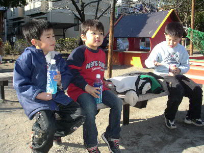 | 1月10日(日) この日は、家でゴロゴロしようとしてたらカミさんが、 「掃除するから、あんたらどっか出かけてきなさい!」 と言う事でダイキと僕は外に出されました(笑) 0092さんに電話すると、0092さんも子供のお守りらしい^^ 0092さん宅にダイキとお邪魔させて頂き、作戦会議(笑) 近くのトンネル公園?で「かくれんぼ!」で遊んだ後に南行徳のダイエーに遊びに行く事にしました。 僕の車でトンネル公園?向かい「かくれんぼ!」スタート♪ 2時間30分もかくれんぼに付き合わせさせられました(爆) ↑小休止中^^ 左からカツヤ君 ダイキ サトシ君 かくれんぼが終わったと思ったら次は木登り! 自然と触れ合うのも子供の成長には欠かせませんよね☆ 十分公園で遊び次の目的地、ダイエーにGO! ↑遅めの昼食!皆、食べること食べること(笑) 最終目的地、キッズランド♪ ここでは500円払い、子供達は遊び放題^^ 0092さんお疲れ様でした。 お陰様でダイキもハッスルする事ができ、 家に着くなりダイキは、コテンと寝てしまいました^^ チャンチャン♪ |